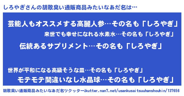 | ヘコむあだ名 | 『しろ太郎』『しろにー』『なまこ酢』 |