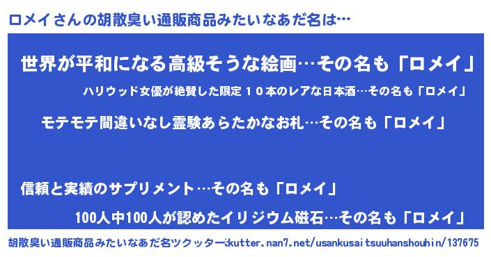 | ヘコむあだ名 | 『ロメもー』『豆乳』『ロメを』 |
