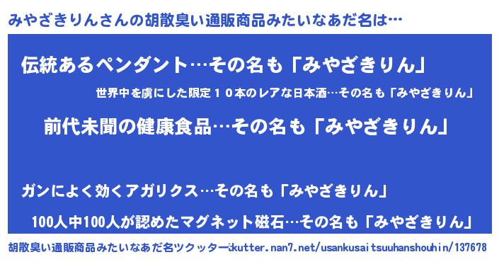 | 男性向けラノベタイトル風あだ名 | 『みやざきりん~年齢イコール彼女いない歴の魔法使い~』 |