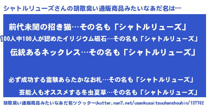 | 意味不明あだ名 | 『とにかく怪しいシャトルリューズ』 |