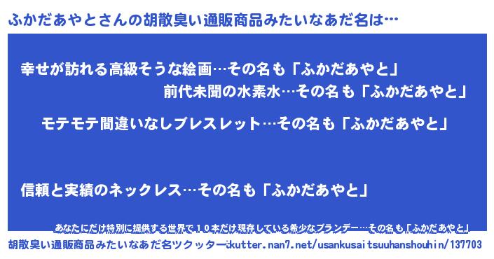 | 恥ずかしいあだ名 | 『プリティーふかだあやと』『ふかっちょ』 |
