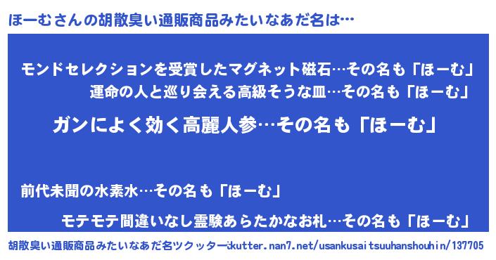 | 男性向けラノベタイトル風あだ名 | 『はたらくほーむさま!』『ほーむの憂鬱』 |