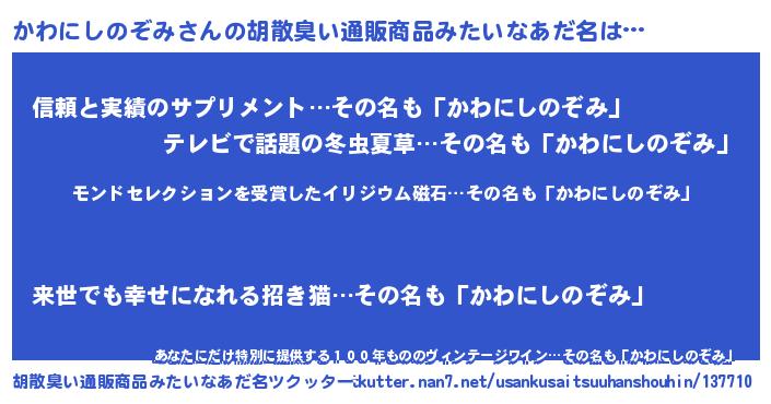 | 男性向けラノベタイトル風あだ名 | 『ノーゲーム・ノーカワニシノゾミ』 |