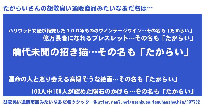 | 意味不明あだ名 | 『永久保存たからい』『ペロリンたからい』 |