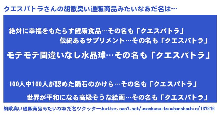 | ヒーロー風カッコイイあだ名 | 『スーパークエスパトラ』『魔戒騎士クエ』 |