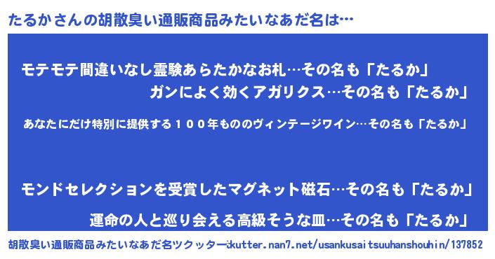 | 意味不明あだ名 | 『住所不定無職たるか(12歳)』『自称たるか』 |