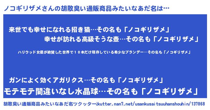 | ヘコむあだ名 | 『ノコギリザメ(遠い目)』『ノコにー』 |