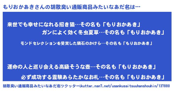 | 男性向けラノベタイトル風あだ名 | 『もりおかあきに滅ぼされるだけの簡単なお仕事です』 |