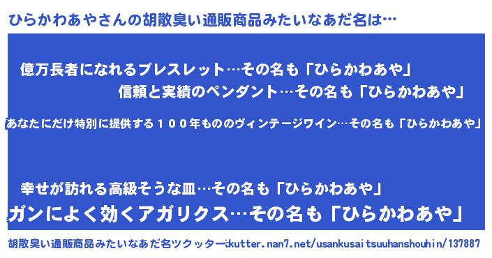 | 恥ずかしいあだ名 | 『プリティーひらかわあや』『ひらっちょ』 |