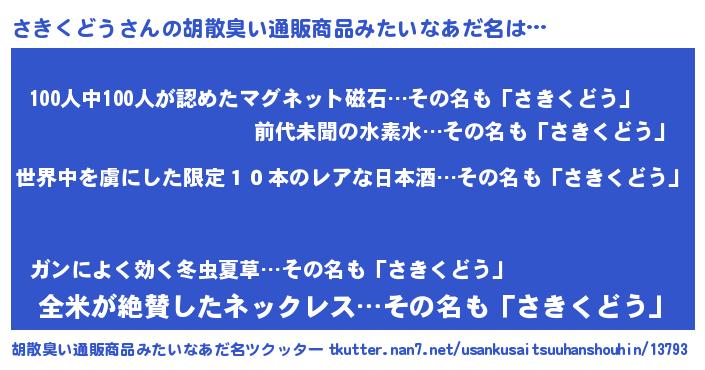 | 意味不明あだ名 | 『住所不定無職さきくどう(53歳)』 |