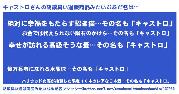 | 男性向けラノベタイトル風あだ名 | 『やはりキャストロの青春ラブコメはまちがっている 』 |