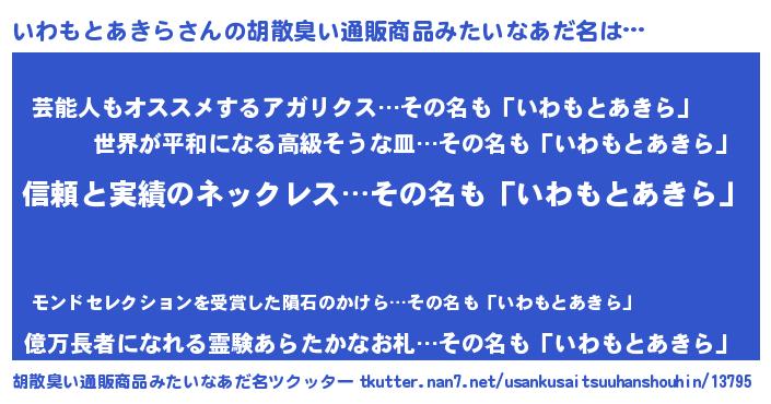 | 意味不明あだ名 | 『とにかく怪しいいわもとあきら』 |