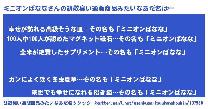 | 女子向けラノベタイトル風あだ名 | 『ミニオンばなな様がみてる』 |