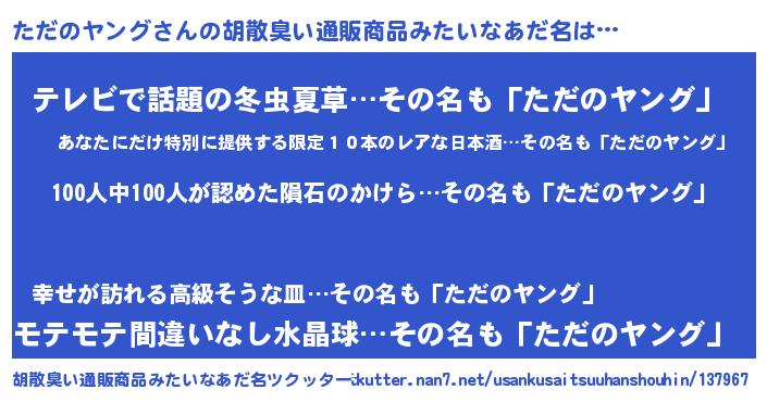 | 男性向けラノベタイトル風あだ名 | 『おまえをオタクにしてやるから、俺をただのヤングにしてくれ! 』 |