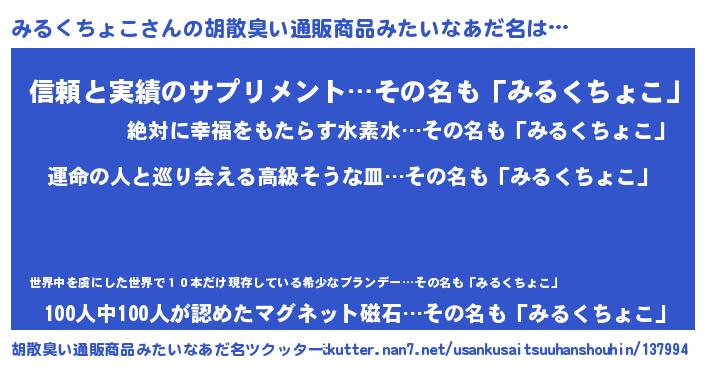 | 欧米人風あだ名 | 『みるくちょこクリステル』 |