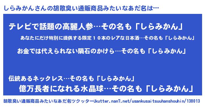| 男性向けラノベタイトル風あだ名 | 『転生したらしらみかんだった件』 |