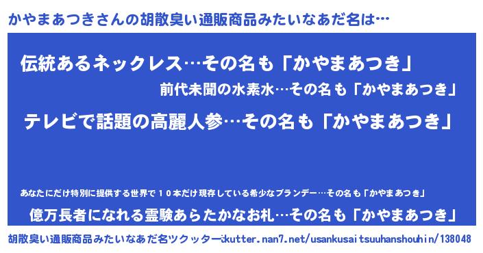 | 恥ずかしいあだ名 | 『カヤマアツキデラックス』『かやちん』 |
