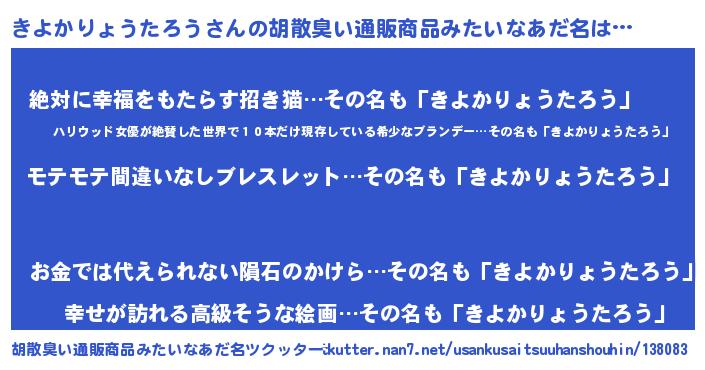 | 男性向けラノベタイトル風あだ名 | 『転生したらきよかりょうたろうだった件』 |