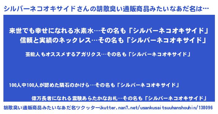 | 男性向けラノベタイトル風あだ名 | 『Re:シルバーネコオキサイドから始める異世界生活』 |