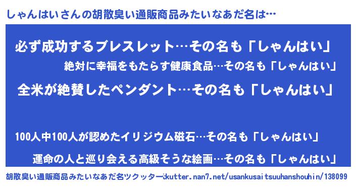| 男性向けラノベタイトル風あだ名 | 『しゃんはいの嫁は女の子じゃないと思った?』 |