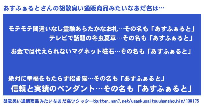 | ヘコむあだ名 | 『あすふぇ~』『あすぷりん』 |