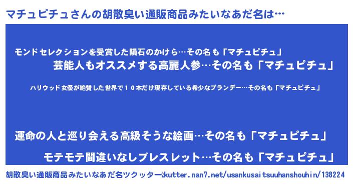 | 意味不明あだ名 | 『住所不定無職マチュピチュ(95歳)』 |