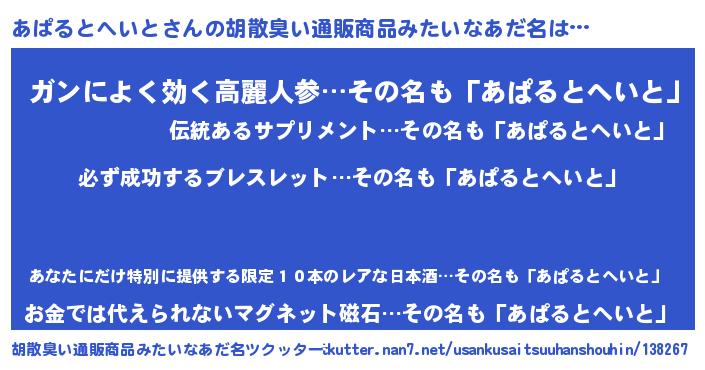 | 欧米人風あだ名 | 『アンジェラ・あぱるとへいと』 |