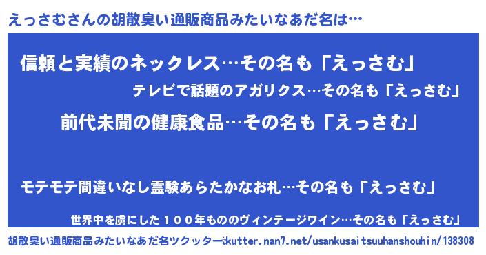| ヘコむあだ名 | 『えっさむ(苦笑)』『えっお』『豆乳』 |