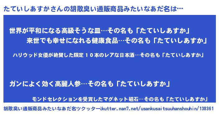 | 意味不明あだ名 | 『住所不定無職たていしあすか(56歳)』 |