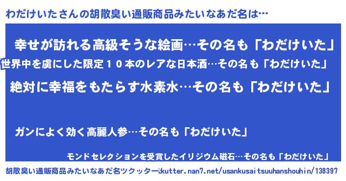| 意味不明あだ名 | 『永久保存わだけいた』『自称わだけいた』 |