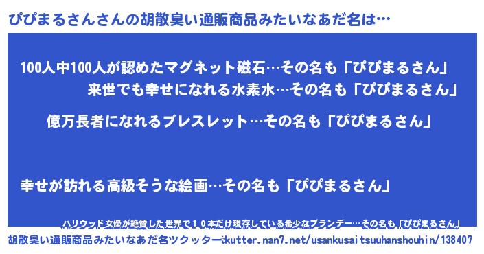 | 男性向けラノベタイトル風あだ名 | 『ぴぴまるさん~年齢イコール彼女いない歴の魔法使い~』 |