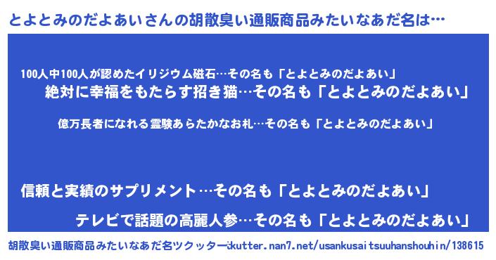 | ヘコむあだ名 | 『とよっふぃ~』『とよとみのだよあい(爆)』 |