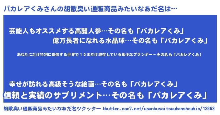 | 男性向けラノベタイトル風あだ名 | 『この素晴らしい世界にバカレアくみを!』 |