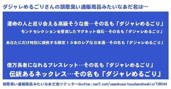 | 意味不明あだ名 | 『住所不定無職ダジャレめるごり(43歳)』 |
