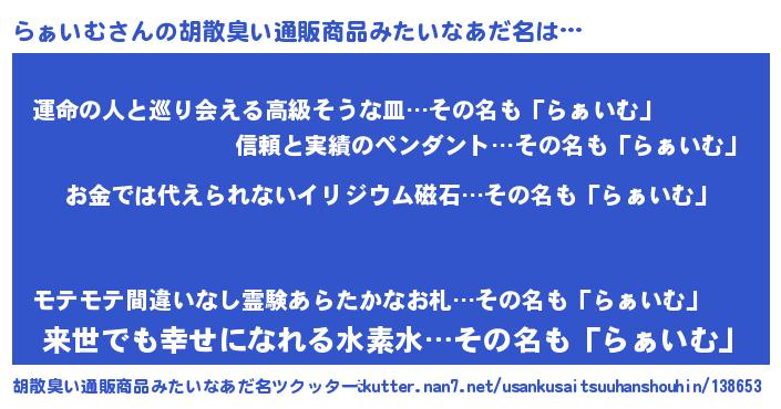 | ヘコむあだ名 | 『豆乳』『らぁいむ(震え声)』 |