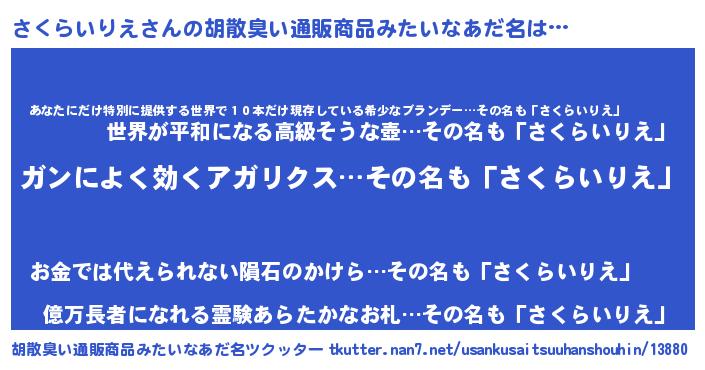 | 恥ずかしいあだ名 | 『サクライリエデラックス』『さくっちょ』 |