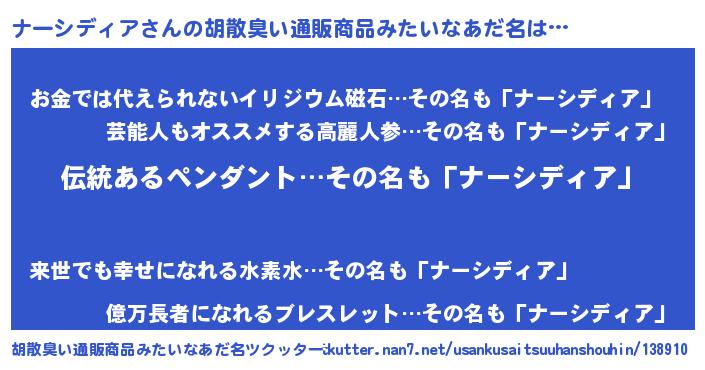 | 男性向けラノベタイトル風あだ名 | 『ナーシディアの嫁は女の子じゃないと思った?』 |