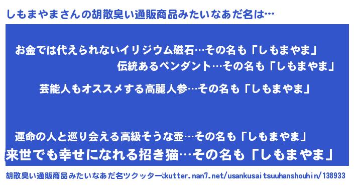 | 意味不明あだ名 | 『自称しもまやま』『永久保存しもまやま』 |