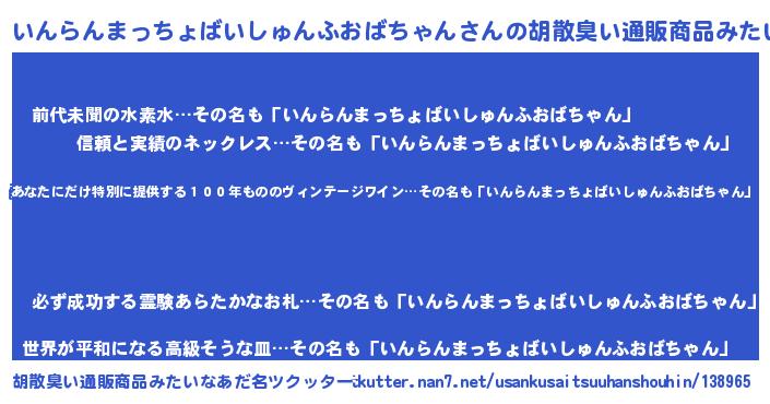 | 男性向けラノベタイトル風あだ名 | 『この素晴らしい世界にいんらんまっちょばいしゅんふおばちゃんを!』 |
