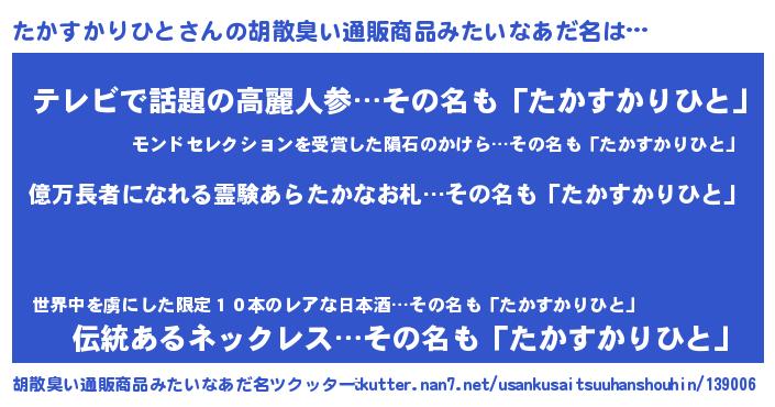 | 男性向けラノベタイトル風あだ名 | 『タカスカリヒトアートオンライン』 |