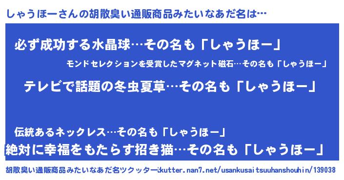 | ヘコむあだ名 | 『しゃもー』『しゃうほー(笑)』 |