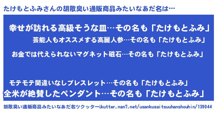 | 肩書あだ名 | 『たけもとふみ船長』『たけもとふみ団長』 |