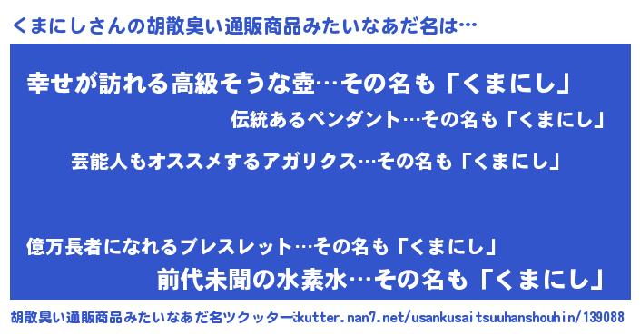 | 意味不明あだ名 | 『ニラ科くまにし属』『自称くまにし』 |