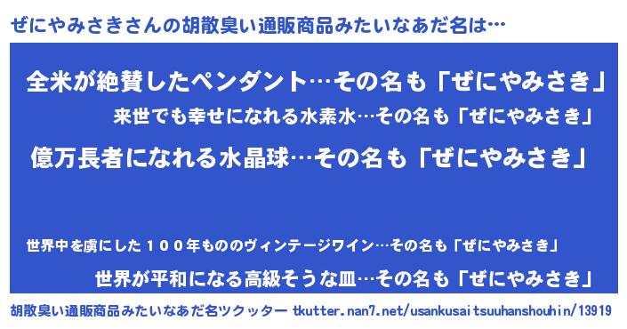 | 男性向けラノベタイトル風あだ名 | 『うちのぜにやみさきが世界を掌握している!』 |