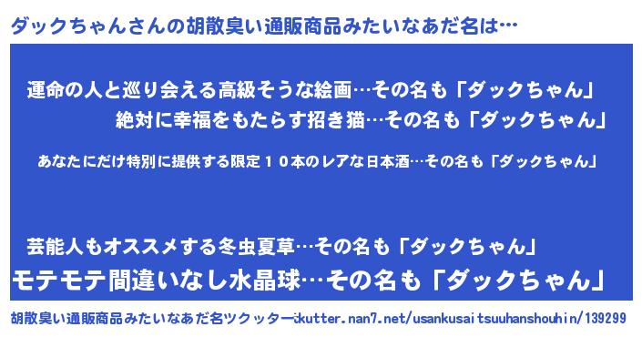 | 男性向けラノベタイトル風あだ名 | 『この素晴らしい世界にダックちゃんを!』 |