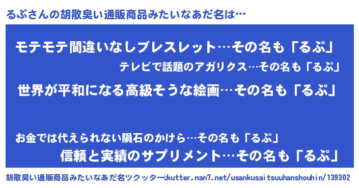 | ヘコむあだ名 | 『豆乳』『るぷふぇ~』『るぷを』 |