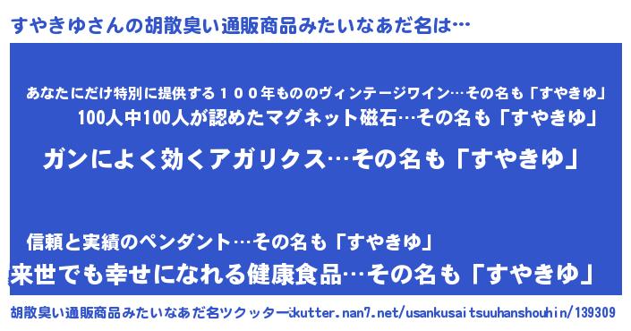 | 意味不明あだ名 | 『自称すやきゆ』『永久保存すやきゆ』 |
