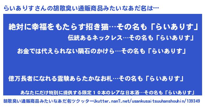 | 男性向けラノベタイトル風あだ名 | 『おまえをオタクにしてやるから、俺をらいありすにしてくれ! 』 |