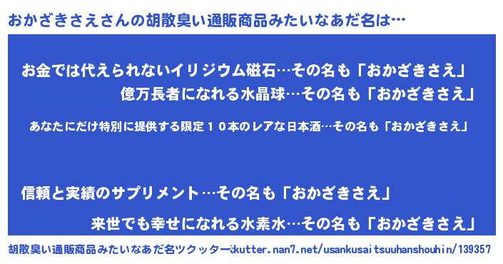 | 男性向けラノベタイトル風あだ名 | 『おかざきさえに滅ぼされるだけの簡単なお仕事です』 |
