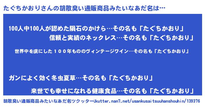 | 男性向けラノベタイトル風あだ名 | 『この素晴らしい世界にたぐちかおりを!』 |